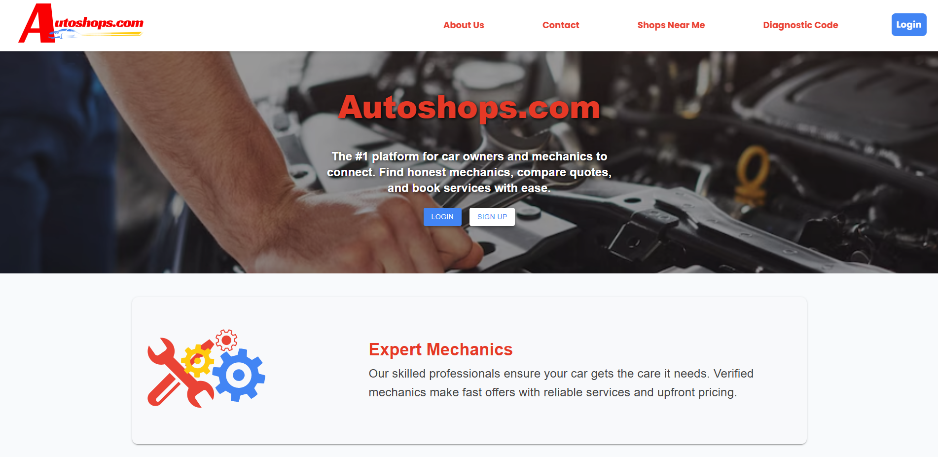 Autoshops.com is an early stage startup that connects customers with local auto repair shops. The frontend of the website is contructed with React and Material UI, a library of pre-built React components. Authentication and data presentation is handled by calling APIs that are connected to a SQL database.